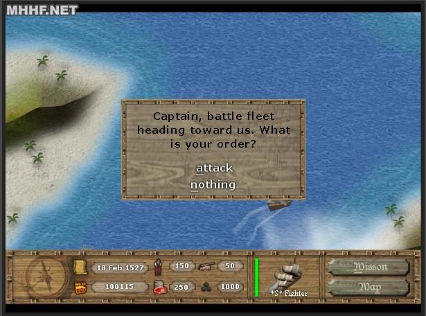 至于说碰到敌人,在你弱小或者不想开战的时候,可以点NOTHING,那样的话,除非是海盗要打你,否则一律可以继续航行.如果说你想惹事生非,增加战斗等级,那就点ATTACK,不过要注意的是,你要有足够大的船,足够多的水手,足够多的炮弹.否则死亡还是非常接近滴......