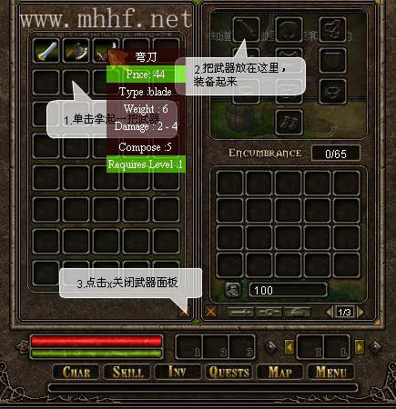 最后就是小提示了,当你的等级不够的时候,哪怕你攻击再高,也不能越级杀死那些显示???的怪的,所以千万别贪心,看到地图上显示红字的"注意危险"提示时,就赶紧的撤退,否则挂了,掉经验和钱就不好了.