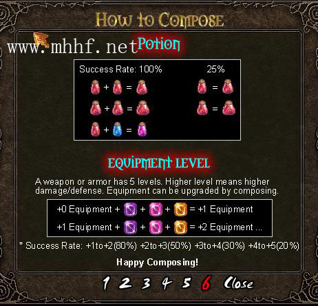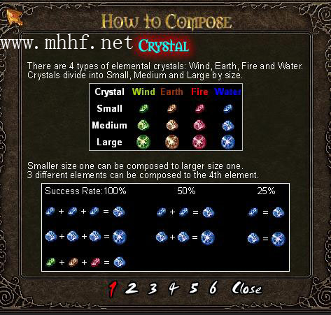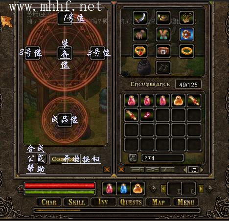 1号2号3号位置,是放石头,宝石同药水的位置,装备位是放装备滴,所有物品都放好以后,按下开始按钮,就会启动合成,之后在成品位置把你已经合好的东西拿出来就完成了.一般有英语基础的朋友,甚至可以跳过以下内容,直接去游戏里看合成公式帮助里阅读了.