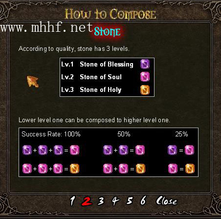 与上面的道理相同,升级专用的祝福石,灵魂石,神圣石也是分等级的,3个低级的,可以合成1个高级的,同样也可以拼人品,用2个石头去赌50%几率,用1个石头去赌25%几率.