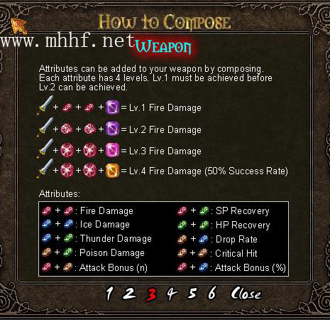 这个就需要详细一些了,是关于武器的合成属性和公式,要特别注意的是,武器的属性提升,是需要有基础的,也就是说,先要有LV1的火伤害做基础,才能用相对应的石头提升火伤害LV2,而不能说直接提升到火伤害LV2.