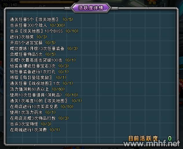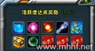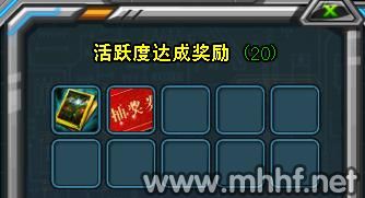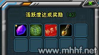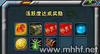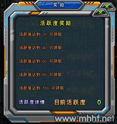 6.加入了〖活跃度奖励〗功能,每日的活跃度分别达到20,40,60,80,100,的时候可以领取相应的奖励,可以查看〖活跃度详情〗,了解目前活跃度达成状态及明细表
