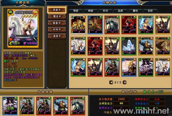 6.参加战斗,英雄卡必需5张,魔法卡必需5张以上,最多10张,装备卡最多5张,其中出战英雄卡可设立一位主将