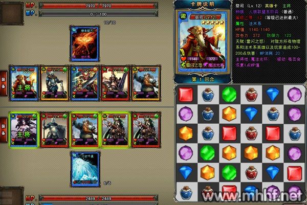 11.消除生命药水,英雄卡和玩家恢复一定的HP值,消除魔法药水,玩家则增加一定的MP值,英雄发动技能和主将技,或是发动魔法卡,都需要消耗一定的MP值