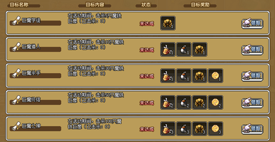 3、击杀巨魔30次,可获得:神力矿工包×1,雷管×1,巨魔雕像×1,挖矿徽章×1)