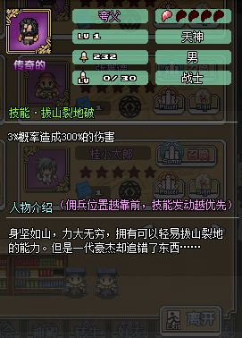 己方战力低于40%时,15%概率发动,造成己方损失战力60%的伤害。