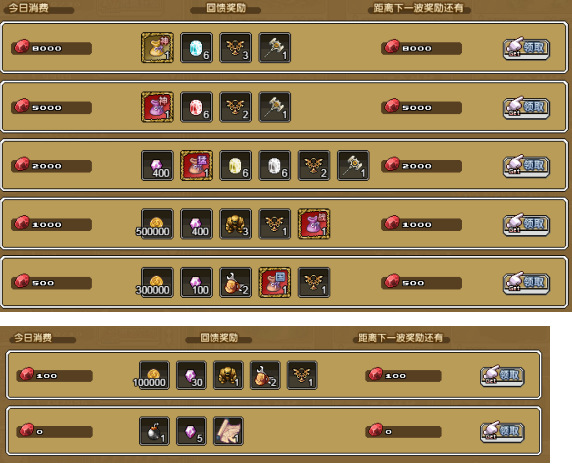 1、单日消费满8000血钻,即可获得:神话贰礼包×1,碧魂晶×6,冒险徽章×3,高级锻造锤×1