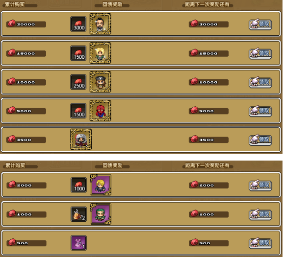 5、单日消费满500血钻,即可获得:金币×300000,荣誉碎片×100,三国英雄礼包×1,冒险徽章×1,神力矿工包×2