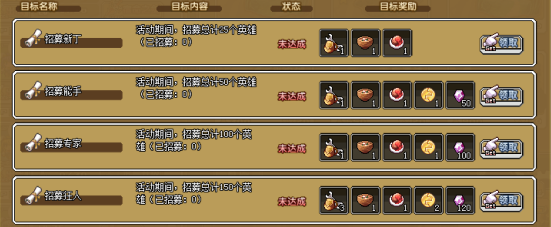 1、招募英雄次数达到25次可获得:神力矿工包×1,一乐拉面×1,牛肉盖浇饭×1,